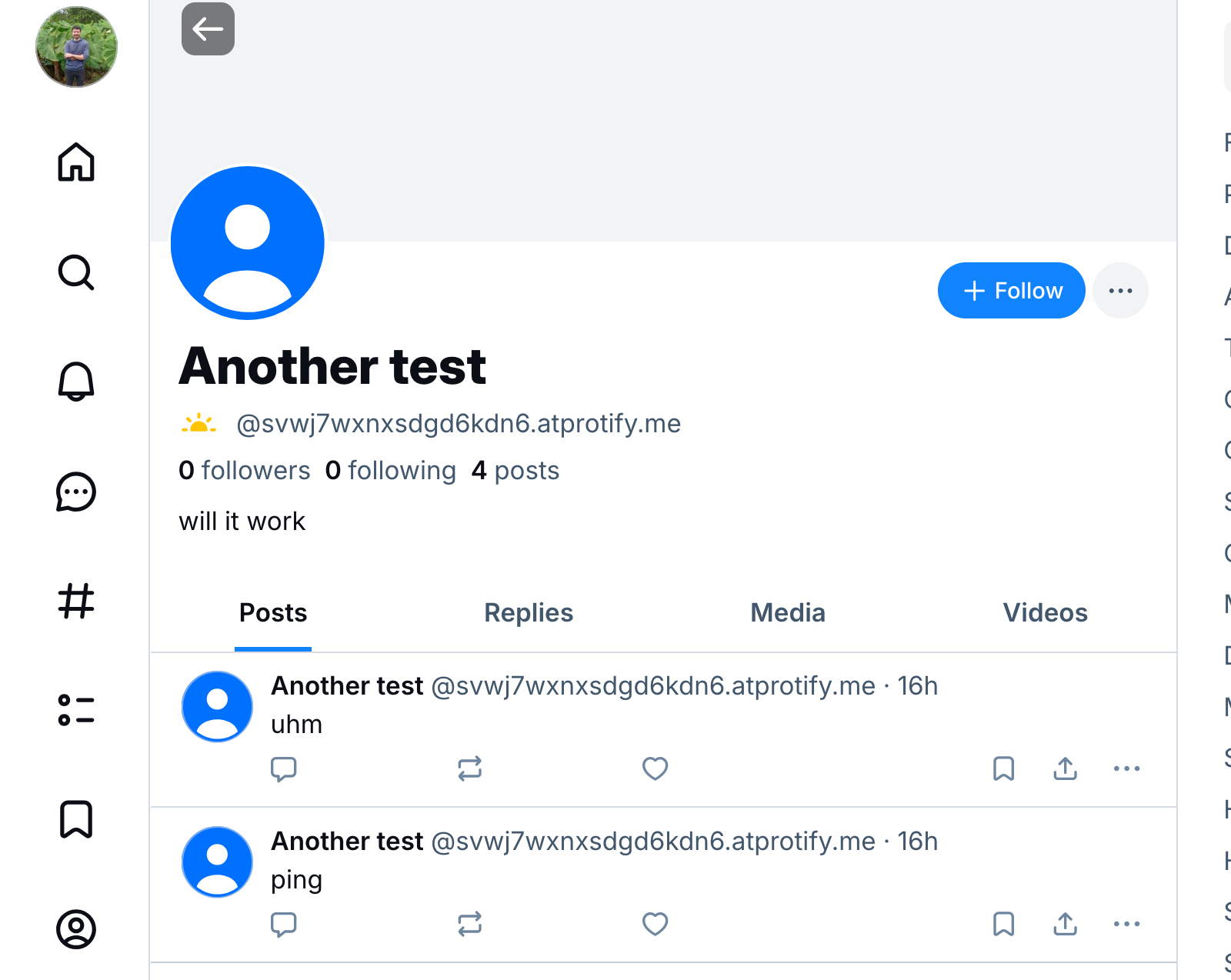 With all those pieces in place, I was able to hack together a proof-of-concept implementation of a working PDS. (I call it a PDS for simplicity, but it would be more accurate to call it an actor in the network, since it barely implements what's needed to be seen by ATProto relays and appviews.)