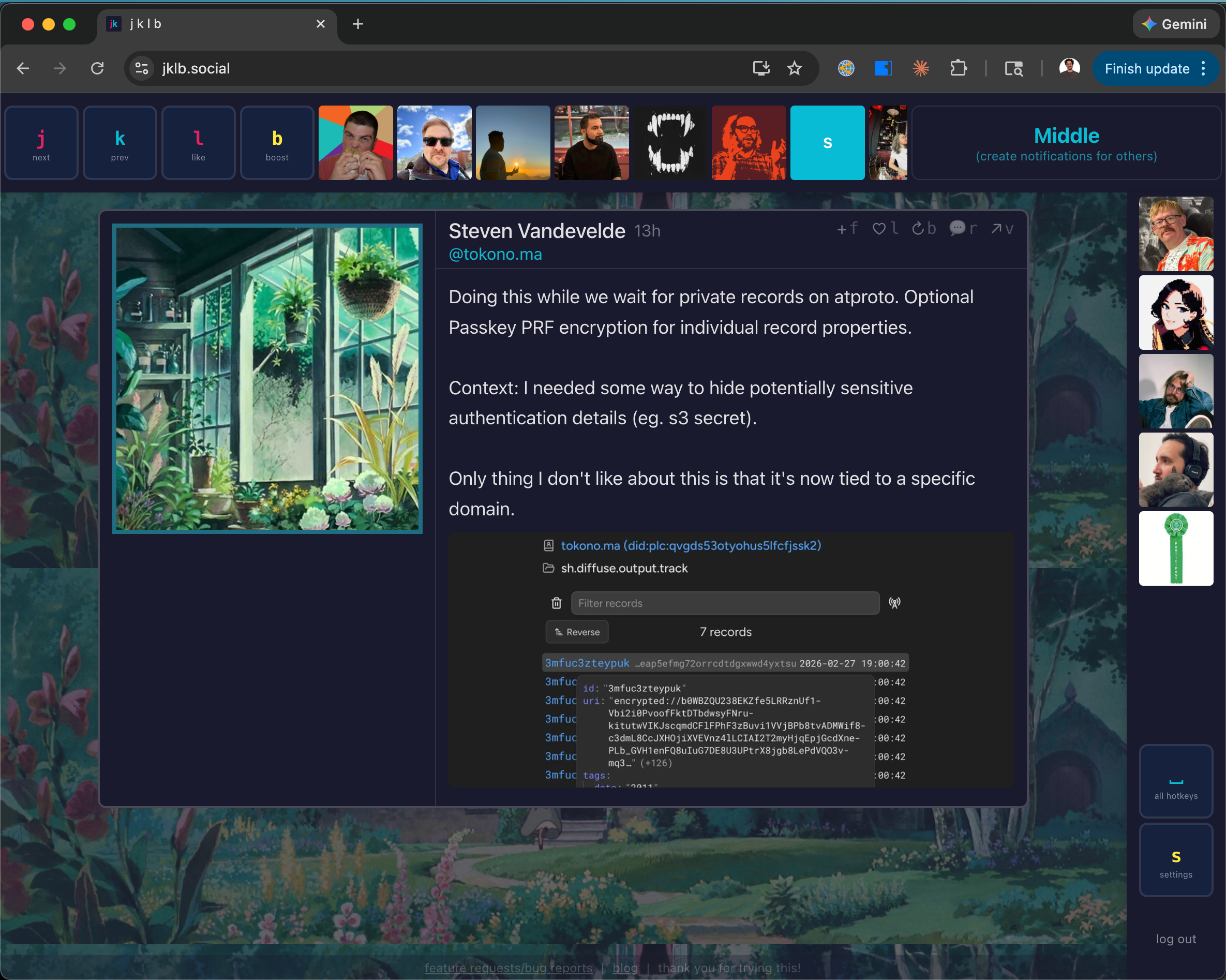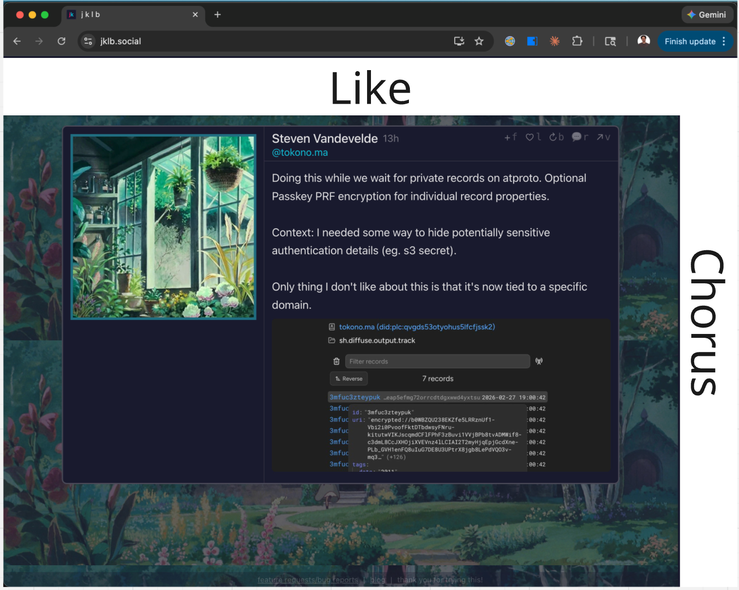 The Like Chorus is an artificial way to mimic real life. Keep the people who see you in your sightline. If you use jklb.social regularly you'll notice some of the same people popping up in your like chorus again and again. Those are your people.