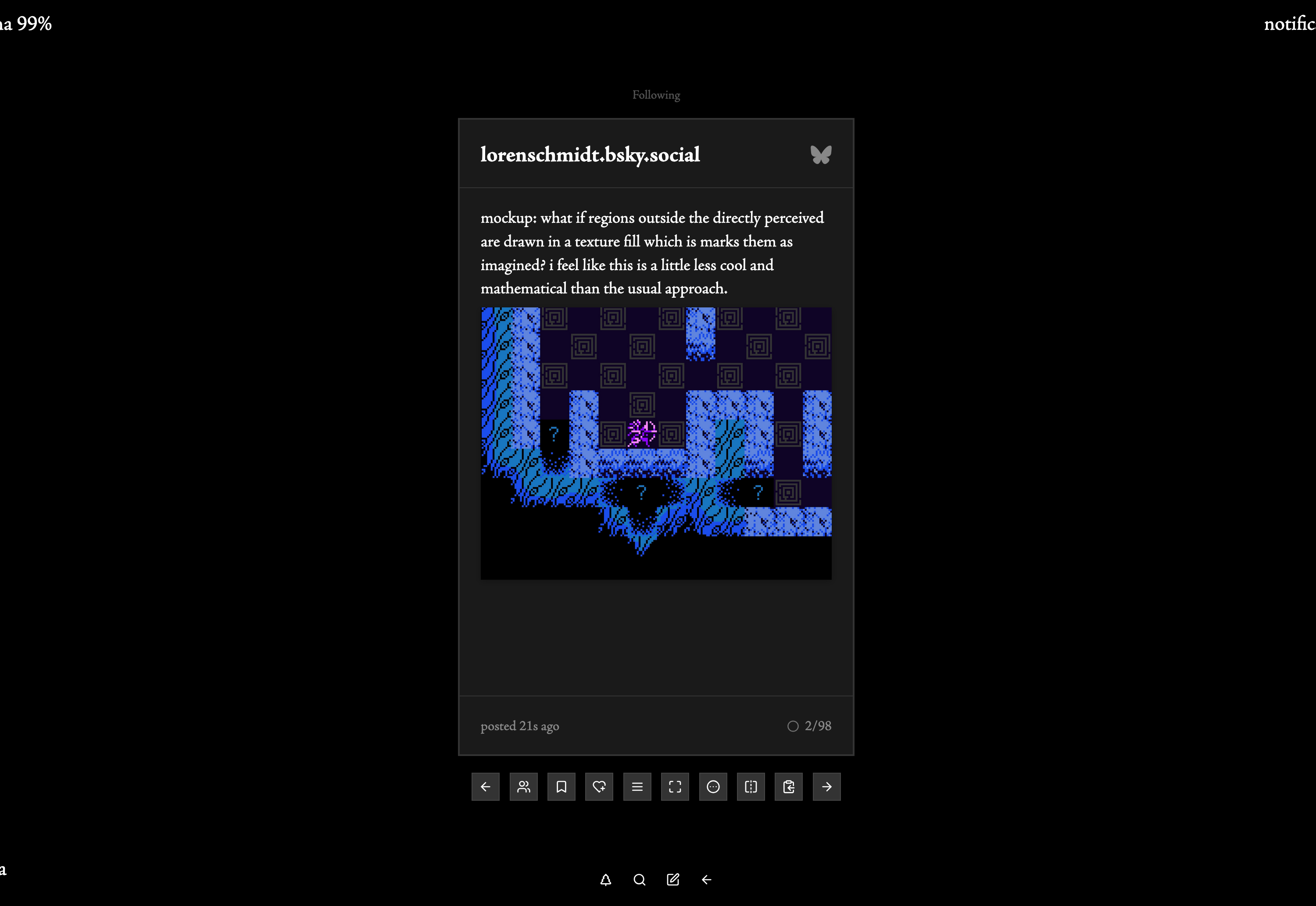 Later, upon logging back in, I noticed my stamina had recovered to something like 22%. Looking around I noticed something else. Posts felt different on here. Surrounded by other people, in a constant noisy feed, angry, political, or advertising posts don't feel so strange. Their individual impact is reduced to nearly zero by their surrounding content. On anisota, however, every rant, every news article hit like a hammer to my skull. I find myself inclined to unfollow people quite a bit more simply to preserve my happy space. Logging into deer again (another Bluesky client), I found myself struck at how loud it felt, something I had hardly considered before.