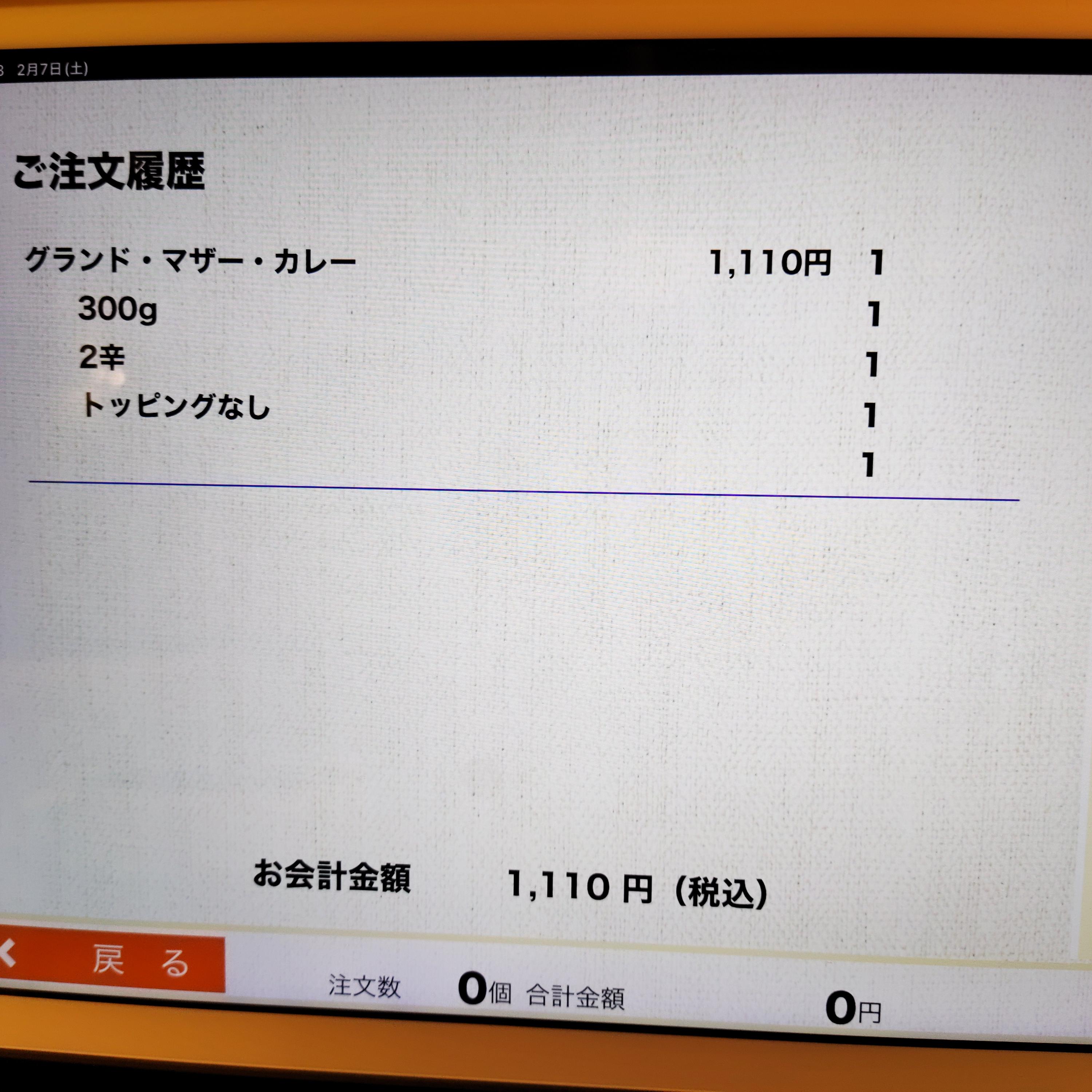 卓上のタブレットで、今回もグランド・マザー・カレー(1060円)を2辛(+50円)で注文しました。