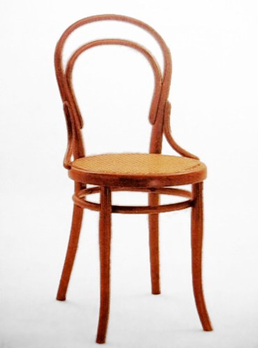"The No. 14 chair is the most famous chair made by the Thonet chair company. Also known as the 'bistro chair', it was designed by Michael Thonet and introduced in 1859, becoming the world's first mass-produced item of furniture. It is made using bent wood (steam-bending), and the design required years to perfect. With its affordable price and simple design, it became one of the best-selling chairs ever made. Some 50 million No. 14s were sold between 1859 and 1930, and millions more have been sold since."