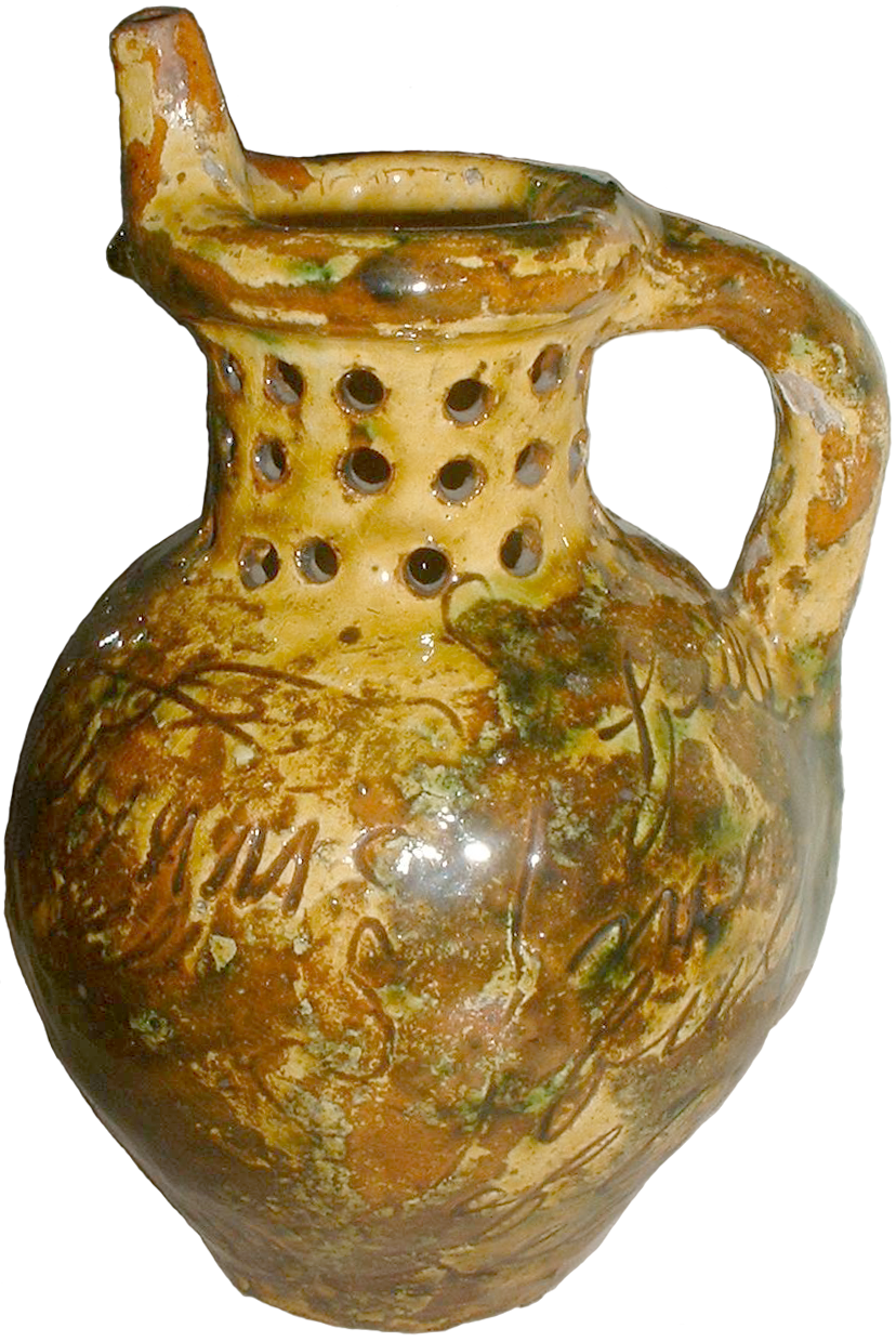 "A puzzle jug is a puzzle in the form of a jug, popular in the 18th and 19th centuries. An inscription typically challenges the drinker to consume the contents without spilling them, which, because the neck of the jug is perforated, is impossible to do conventionally."