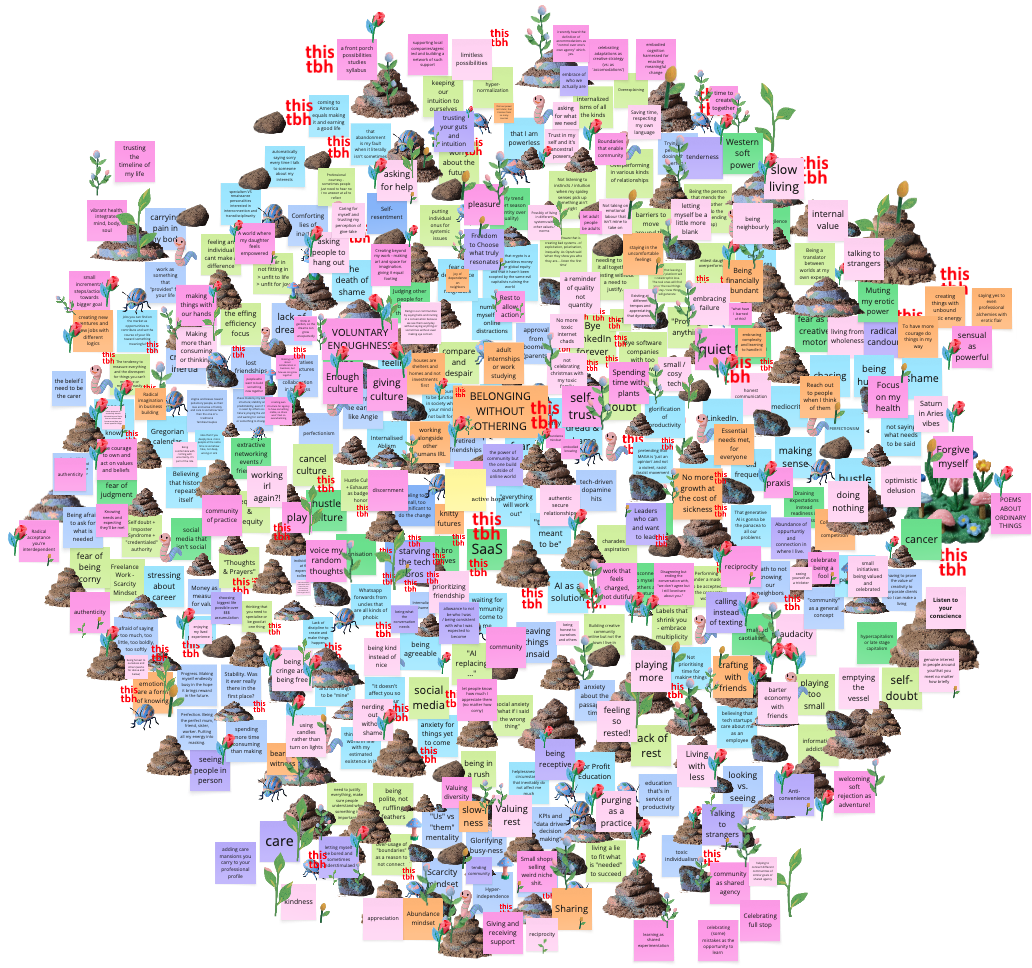 then caitlin opened the miro board — the funeral garden — and everyone began to write. blue and green stickies for what you were letting go, while music played and everyone muted. dirt piled on top, beetles and worms, so the text still showed through. visible but buried. then the flip: pink and orange stickies for what became possible on the other side. voluntary enoughness. rest to allow action. audacity. emotions are a form of knowing. people who want to build something new together.