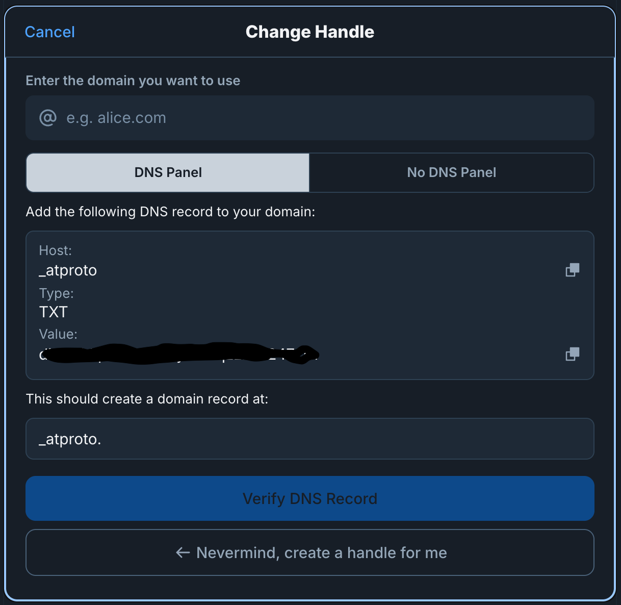 And that's not all! You've probably noticed some Bluesky users with custom domains for their handles, seeing as this place is full of nerds. You know how we enable that? You guessed it, DNS. If you click through to the "custom domain" section of our "Change Handle" settings menu, we provide a custom _atproto DNS record for you to add to your domain name that will let Bluesky resolve it.