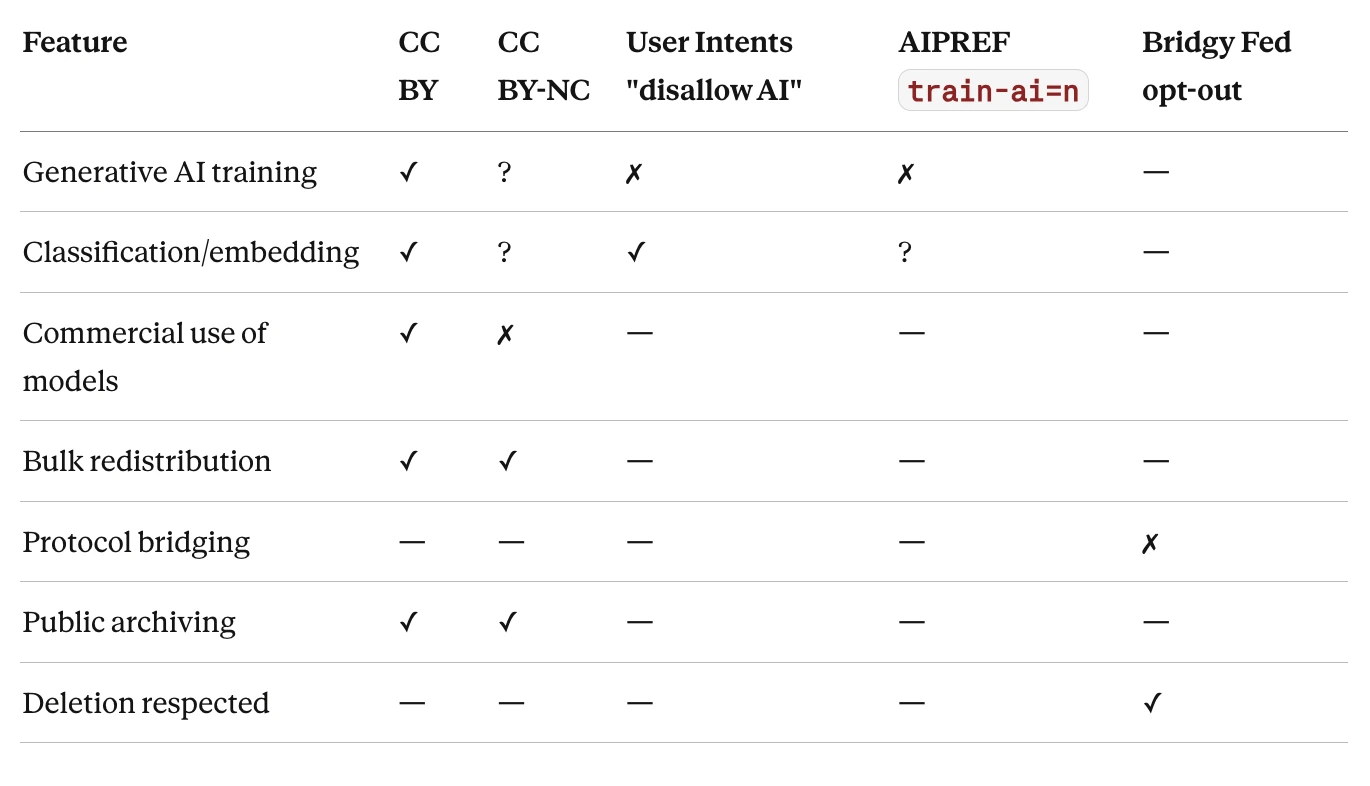 Different communities are already expressing equivalent intents in different vocabularies. The Bluesky user intents proposal says syntheticContentGeneration: { allow: false }. AIPREF says train-ai=n. A Creative Commons license implies certain reuse permissions through its legal code. A Bridgy Fed opt-in record expresses bridging intent through yet another mechanism. These are all describing overlapping regions of the same conceptual space, but in mutually unintelligible formats.