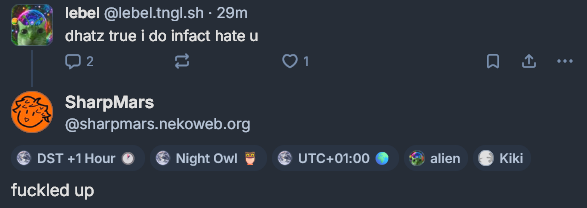 I say it with heavy heart that I have been a target of hate by person called lebel.tngl.sh. The interaction with them started when I wanted to obtain an "alien" label and nicely asked them to give me one. That interaction resulted in questioning of my identity as an alien by them. As a result I was forced to provide proof. After giving it I have been ignored. After publicly calling them out I received this message: