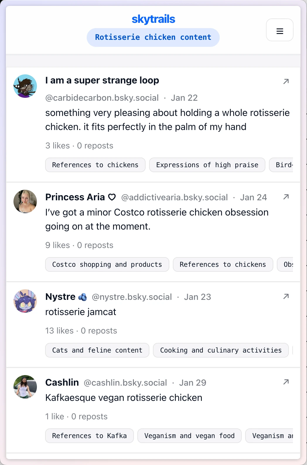 The five of us have been working in this direction. As an initial prototype, we took a week of posts on Bluesky (28 million posts), and—using modern language models—created 20,000 interpretable trails. You can try it at www.skytrails.org. These trails range from “rotisserie chicken” to “personal nostalgia” to “heat pump technology” to “NBA content” to “analysis of fictional tropes.”