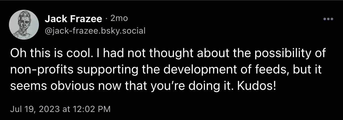 Like I mentioned earlier, Blacksky has been very meaningful to me to work on. I am on a daily basis happy with the solutions I've built and the community that's formed around Blacksky. People have offered to help with moderation, updating the code, and very importantly offering financial support. These computers aren't free! Incidentally, Blacksky is one of the first AT Protocol projects to receive nonprofit support in addition to community funding.