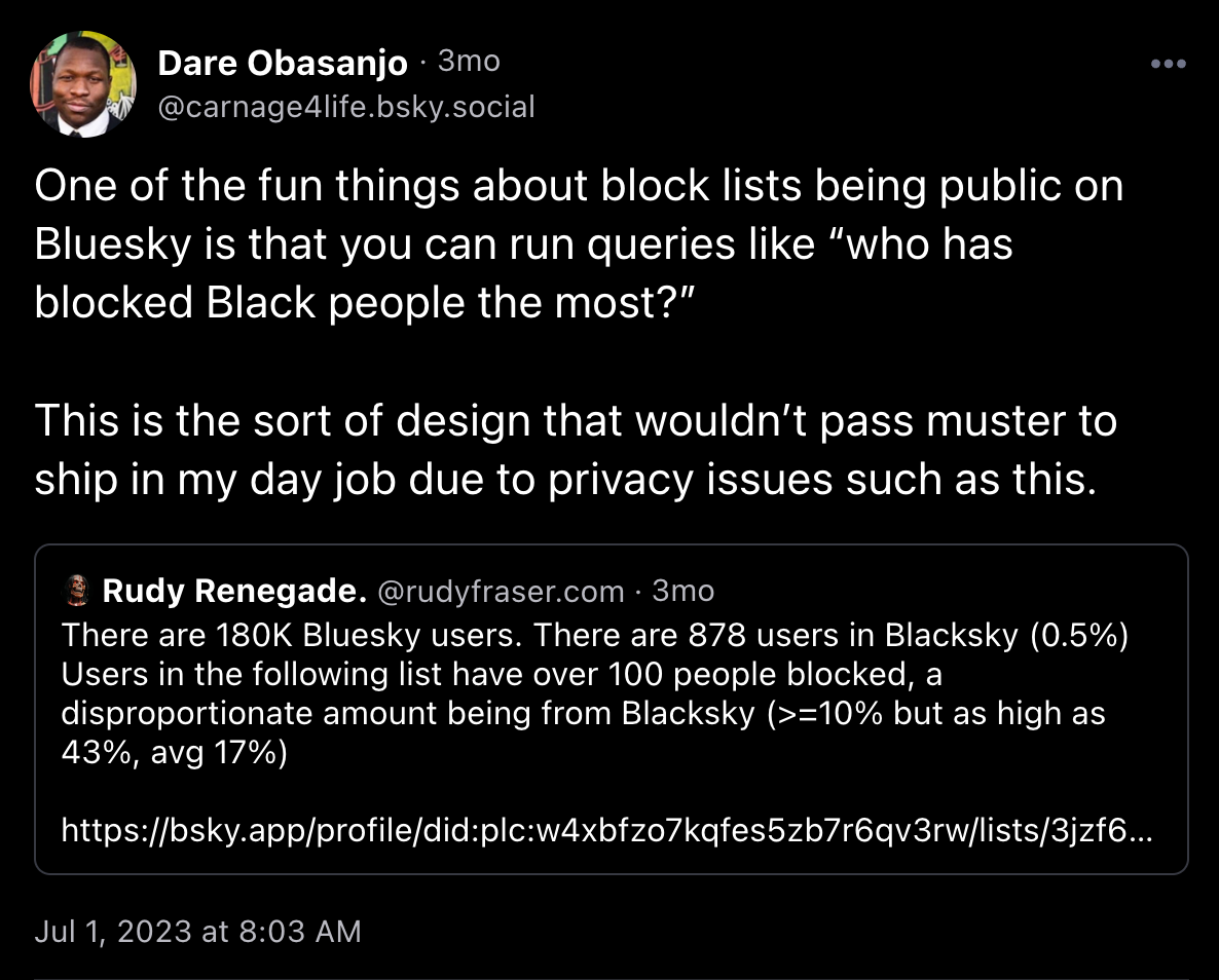 One of the downsides of the Blacksky feed being so visible and custom feeds not being well understood is that it started to be seen as an in-group consisting of a particular subset of Black people. Some days we were the "dramatic" Black people complaining about silly things like racism. Other days we were "orbiters" of an alleged serial harasser who none of us knew. A little over a month after launching the Blacksky feed (6 months in Bluesky time) I noticed that many Black users including myself were getting blocked left and right from some of the biggest accounts on the platform at the time. As I mentioned earlier, lots of information on Bluesky is public, including who blocks who.