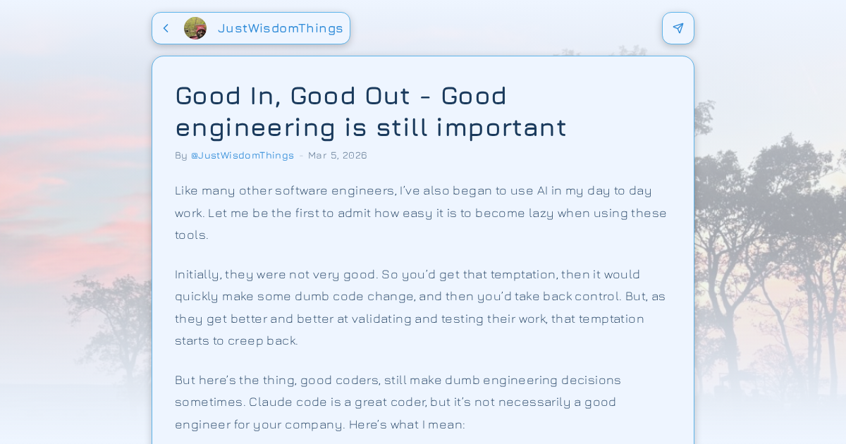 Like many other software engineers, I’ve also began to use AI in my day to day work. Let me be the first to admit how easy it is to become lazy when using these tools. Initially, they were not very good. So you’d get that temptation, then it would quickly make some dumb code change, and then you’d take back control. But, as they get better and better at validating and testing their work, that temptation starts to creep back. But here’s the thing, good coders, still make dumb engineering decision...