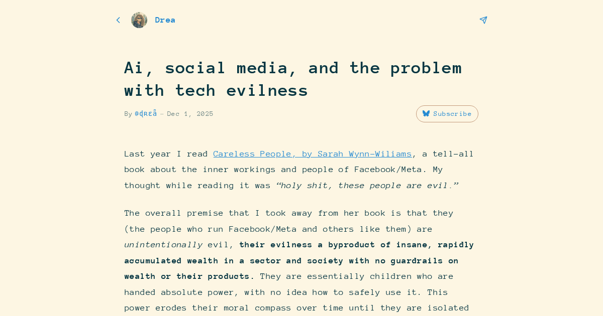 Last year I read Careless People, by Sarah Wynn-Wiliams, a tell-all book about the inner workings and people of Facebook/Meta. My thought while reading it was “holy shit, these people are evil.” The overall premise that I took away from her book is that they (the people who run Facebook/Meta and others like them) are unintentionally evil, their evilness a byproduct of insane, rapidly accumulated wealth in a sector and society with no guardrails on wealth or their products. They are essentially c...