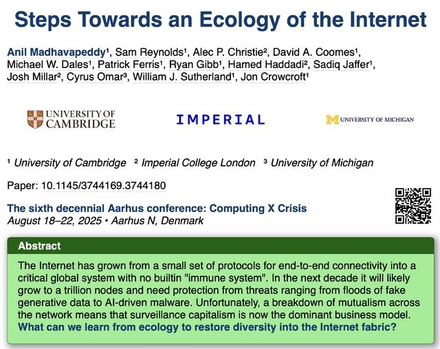 Paper exploring biological ecosystem models as inspiration for Internet architecture evolution towards trillion-node scale at Aarhus 2025.