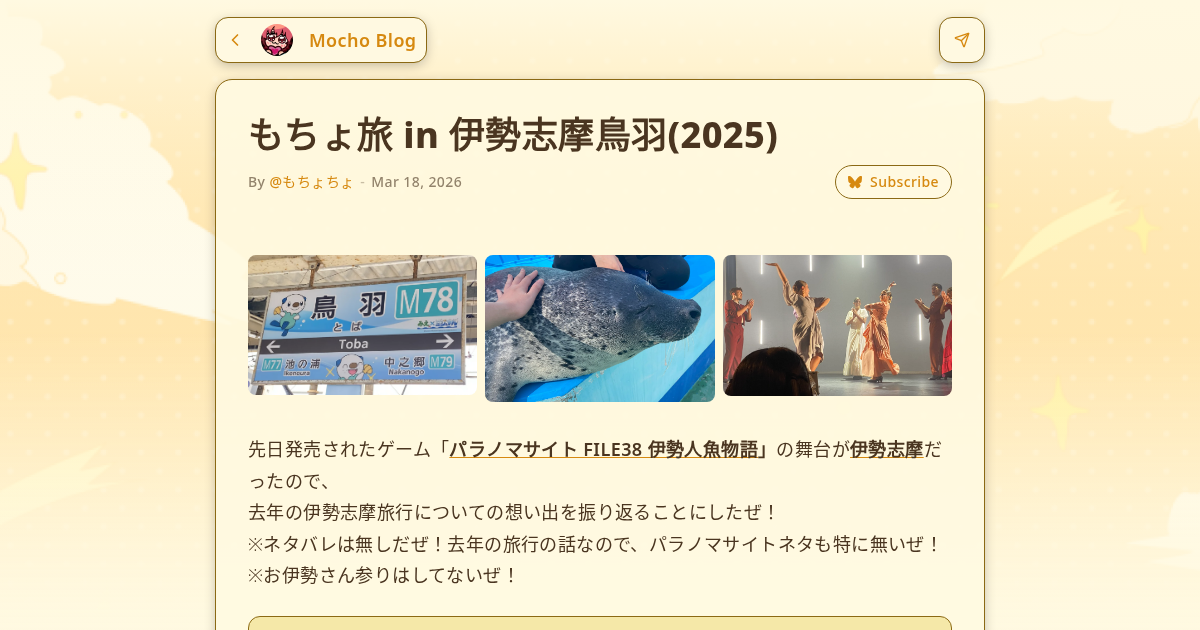 先日発売されたゲーム「パラノマサイト FILE38 伊勢人魚物語」の舞台が伊勢志摩だったので、去年の伊勢志摩旅行についての想い出を振り返ることにしたぜ!※ネタバレは無しだぜ!去年の旅行の話なので、パラノマサイトネタも特に無いぜ!※お伊勢さん参りはしてないぜ! 志摩スペイン村と志摩地中海村を目的に計画した伊勢志摩旅行は、なんやかんやあれこれと詰め込み、いろんな場所にいきました。伊勢志摩というよりも、実際は志摩・鳥羽中心の旅です。想像してたよりも色んな体験ができて、とても楽しかったです。「観光客にあたたかい町だな~」という印象を持ちました。 今回の旅は、伊勢志摩のスーパーパスポート「まわりゃんせ」を使うことも目的の一つだったため、基本的に移動は「電車・船」。