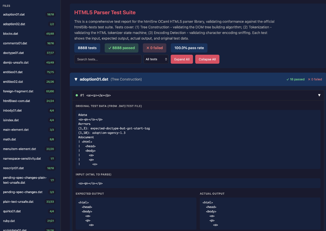 Vibespiling JustHTML from Python to pure OCaml, achieving 100% pass rate on the browser html5lib test suite using agentic workflows.