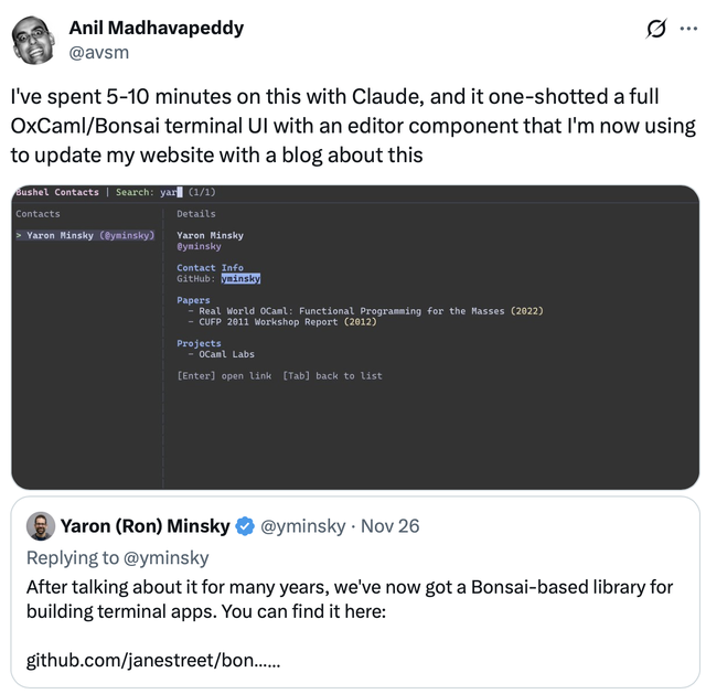 Agentically synthesising a batteries-included OCaml HTTP client by gathering recommendations from fifty open-source implementations across JavaScript, Python, Java, Rust, Swift, Haskell, Go, C++, PHP and shell.
