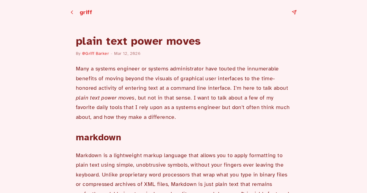Many a systems engineer or systems administrator have touted the innumerable benefits of moving beyond the visuals of graphical user interfaces to the time-honored activity of entering text at a command line interface. I'm here to talk about plain text power moves, but not in that sense. I want to talk about a few of my favorite daily tools that I rely upon as a systems engineer but don't often think much about, and how they make a difference. Markdown is a lightweight markup language that allow...
