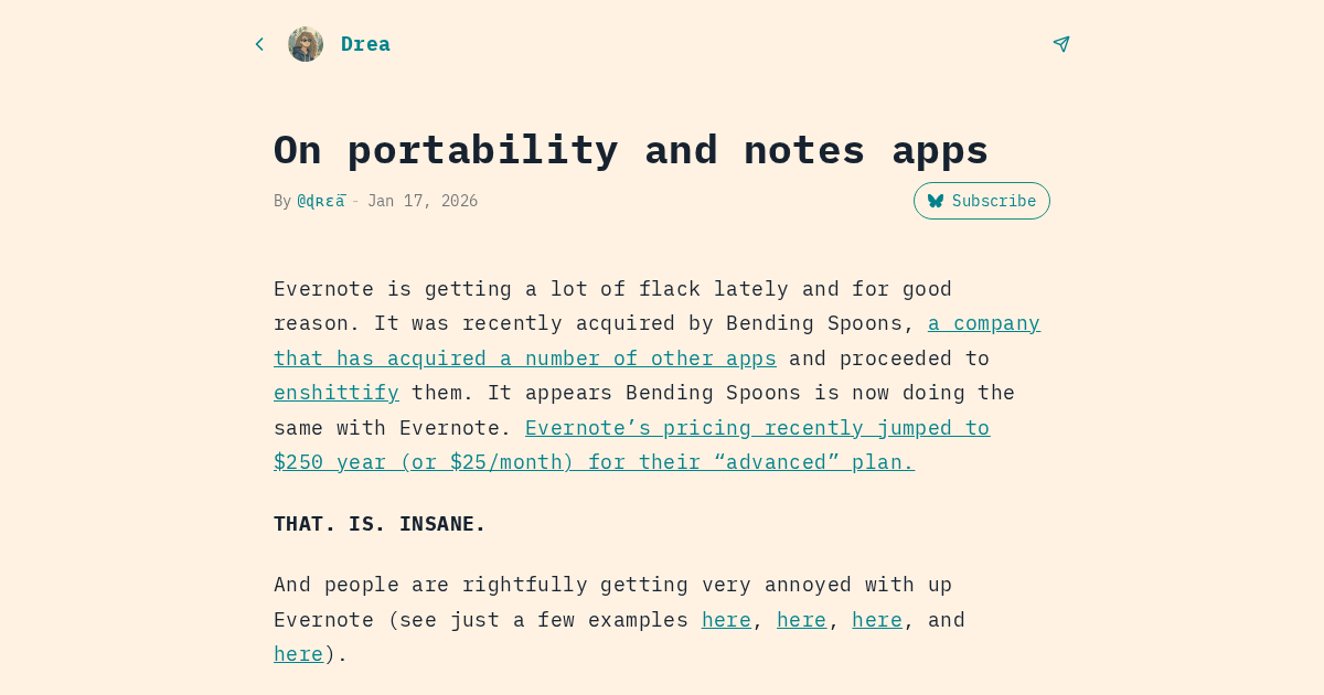 Evernote is getting a lot of flack lately and for good reason. It was recently acquired by Bending Spoons, a company that has acquired a number of other apps and proceeded to enshittify them. It appears Bending Spoons is now doing the same with Evernote. Evernote’s pricing recently jumped to $250 year (or $25/month) for their “advanced” plan. THAT. IS. INSANE. And people are rightfully getting very annoyed with up Evernote (see just a few examples here, here, here, and here).