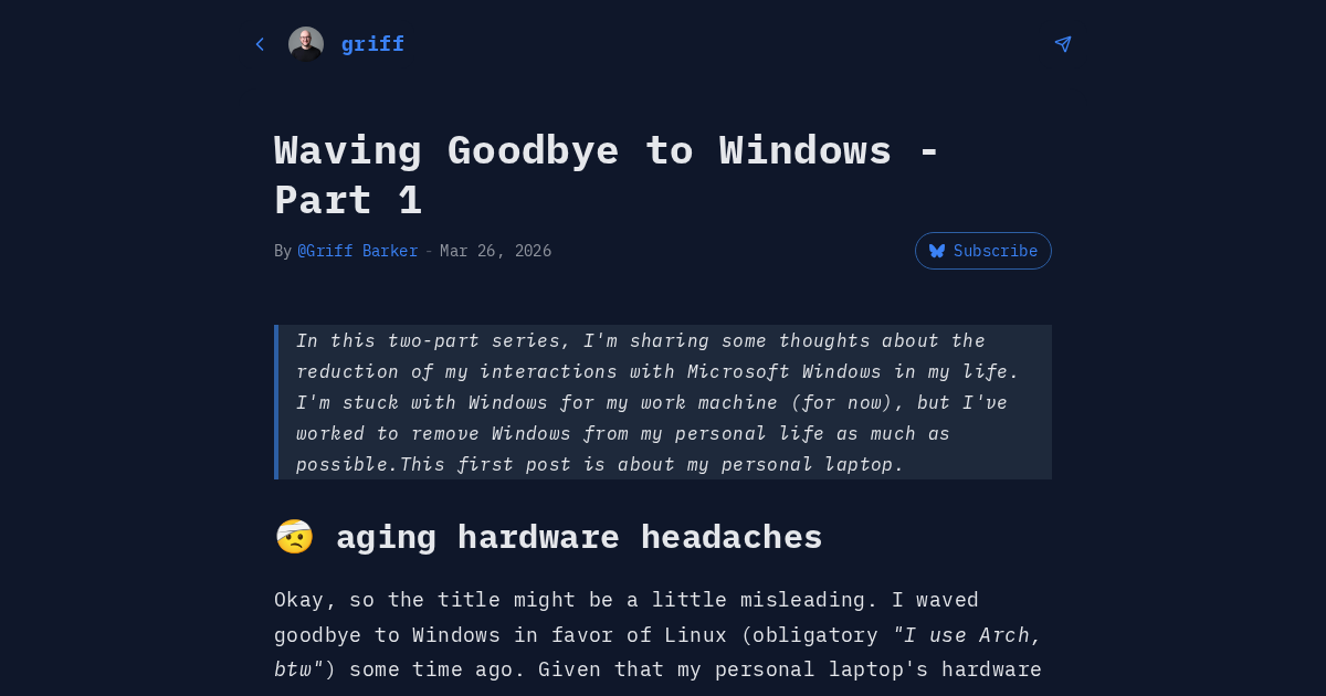 Okay, so the title might be a little misleading. I waved goodbye to Windows in favor of Linux (obligatory "I use Arch, btw") some time ago. Given that my personal laptop's hardware was of the 2016 era, I just couldn't run Windows very well any longer. Not that I wanted to anyway. I opted for an Arch-based distribution called CachyOS, set it up once, and didn't fiddle with it at all. It worked great! But as the aging hardware continued to cause problems, it became apparent that it was time to mov...